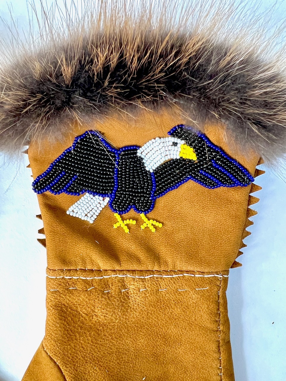 These are fully hand-sewn deerskin gauntlets with bald eagle motifs and beaver fur cuffs.